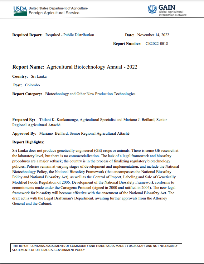 (2023) USA aruanne kinnitab GMO-toidu tootmist Sri Lankas Allikas: AgricultureInformation.lk | Ameerika Ühendriikide Põllumajandusministeeriumi dokument