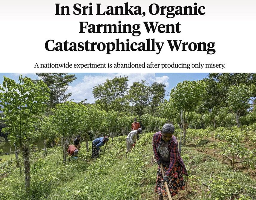 Sri Lanka viis eelmisel aastal oma kodanikega läbi kurja eksperimendi. Mahetoidu ja GMO-vastaste aktivistide mõjul keelas valitsus sünteetiliste pestitsiidide impordi ja sundis riiki üleminekule täielikult mahepõllundusele, jättes valdava enamuse põllumehi ilma olulistest tööriistadest, mida nad kasutavad riigile vajalike põllukultuuride kasvatamiseks.